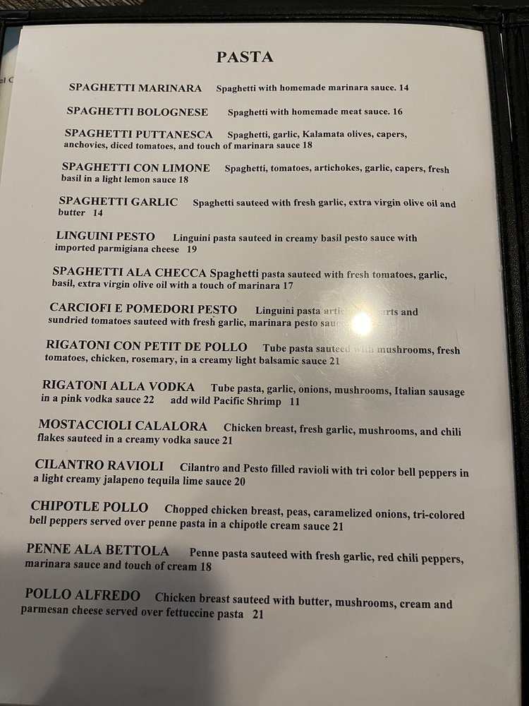 Chicken breast sauteed with butter, lemon, white wine, and capers served with pasta aglio olio.