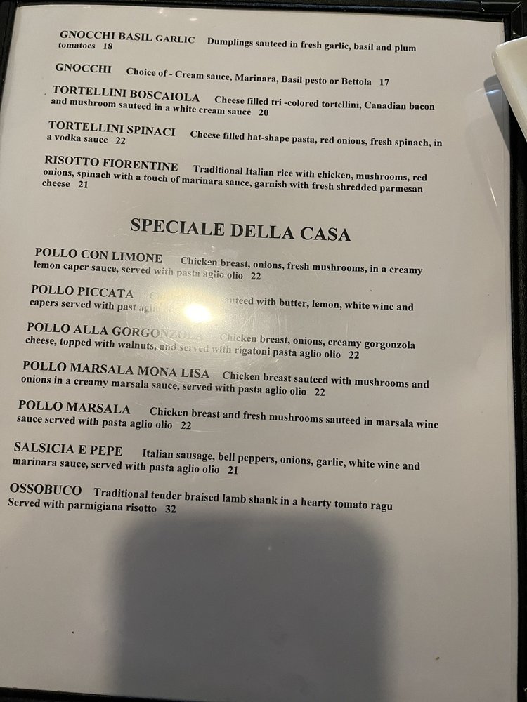 Chicken breast, onions, and fresh mushrooms, in a creamy lemon caper sauce, served with pasta aglio olio.